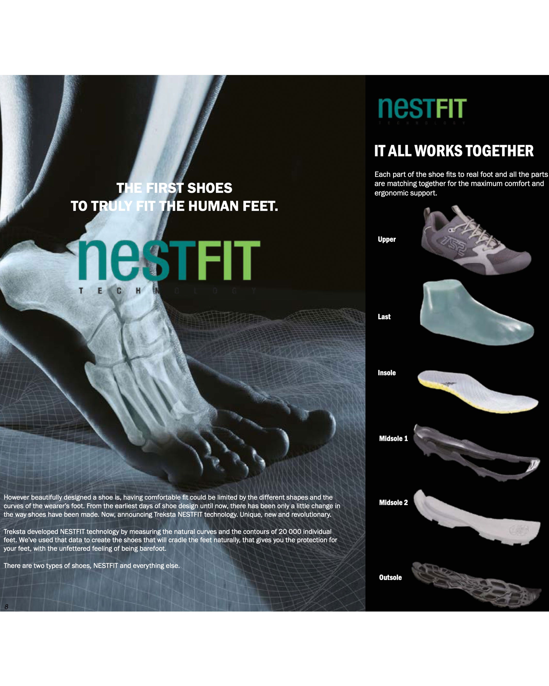 We 3-D scabbed and analyzed feet of 20,000people and created a contour map to allow 226bones and 33joints in feet stay in comfort. That’s why nestFIT Last keeps your feet perfectly comfortable Compared to other trekking shoes, nestFIT takes off the pressures on your feet by 23% and the level of fatigue on muscle by 31%, letting you enjoy outdoor activities with more fun and comfort.